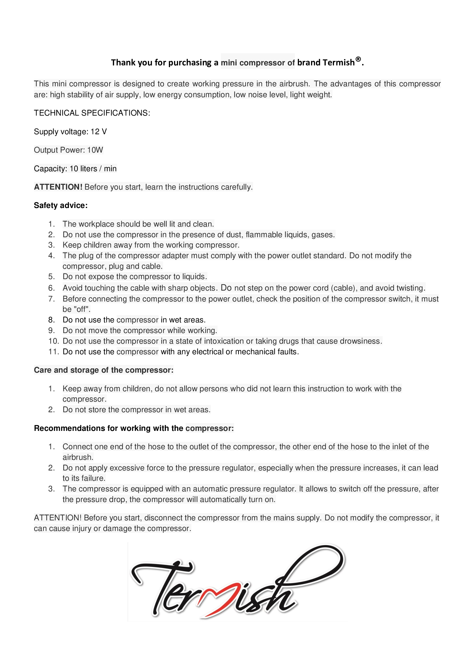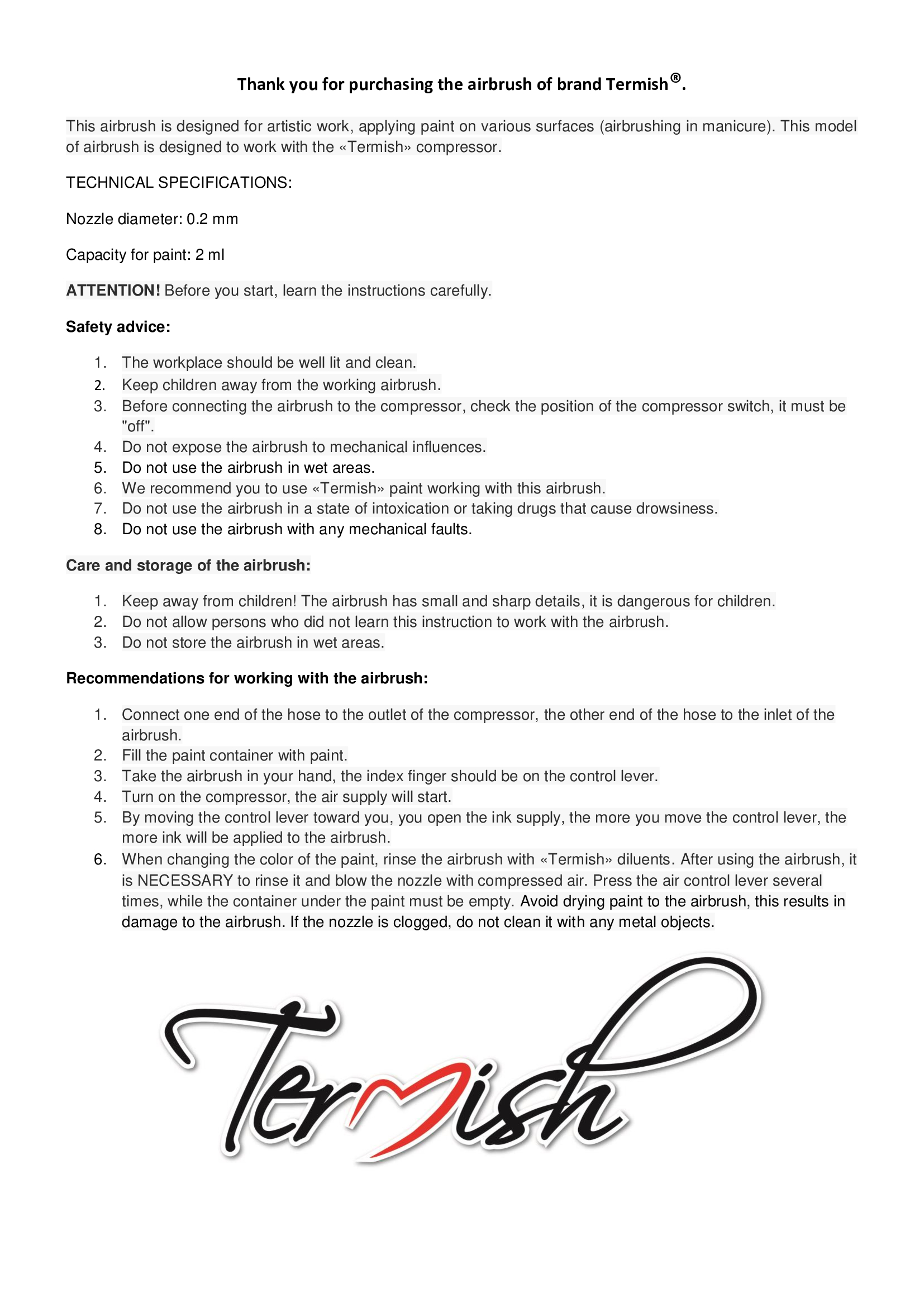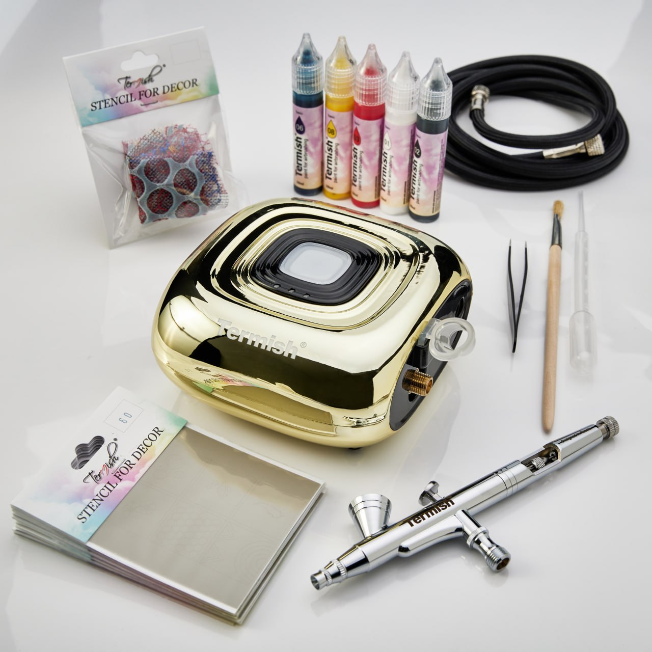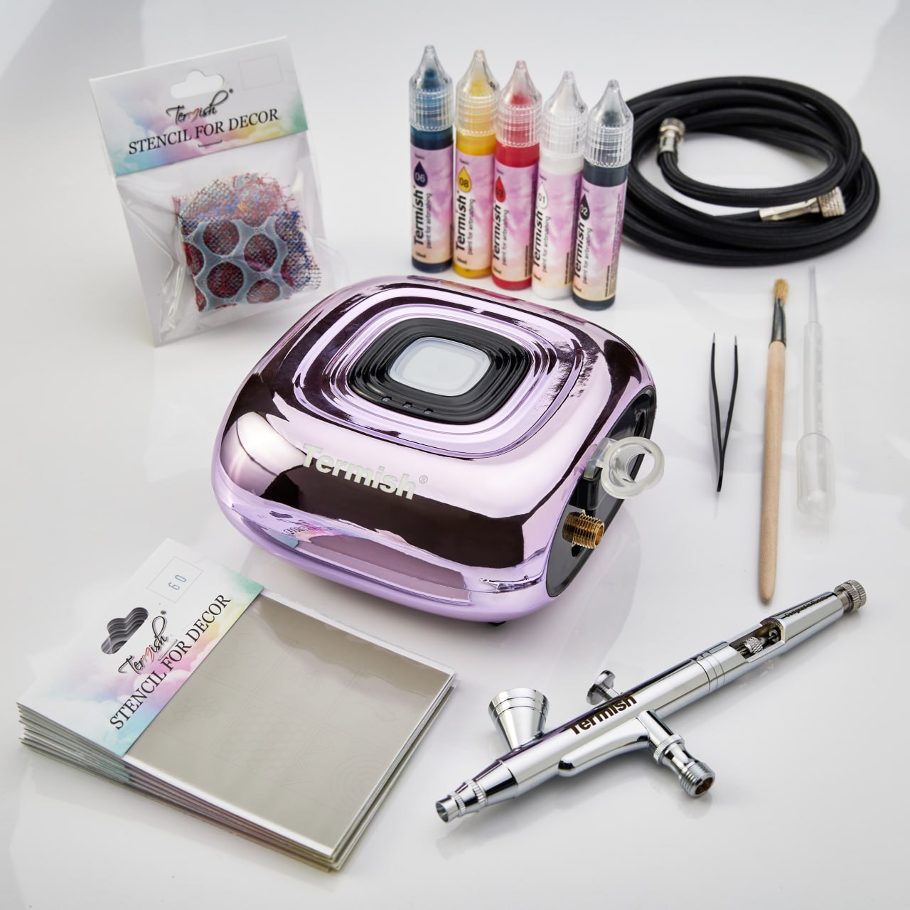Starter kit LILAC compressor, airbrush, hose, adapter, holder, instruction, mini catalog, pen, workbook, white paper bag, base paint 5 pcs of 10ml (01,02,03,06,08), adhesive stencil 10 pieces, lace stencils, certificate, tweezers, brush, pipette.