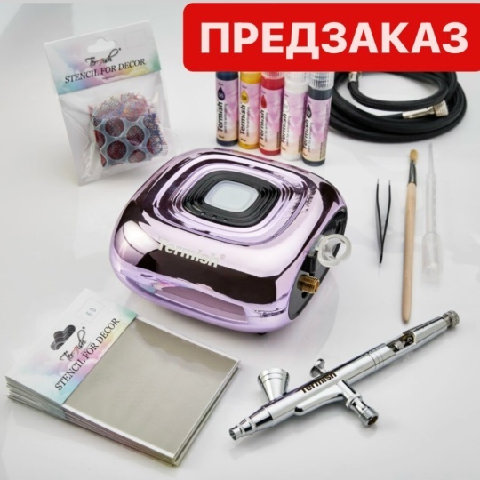 Starter kit LILAC compressor, airbrush, hose, adapter, holder, instruction, mini catalog, pen, workbook, white paper bag, base paint 5 pcs of 10ml (01,02,03,06,08), adhesive stencil 10 pieces, lace stencils, certificate, tweezers, brush, pipette.